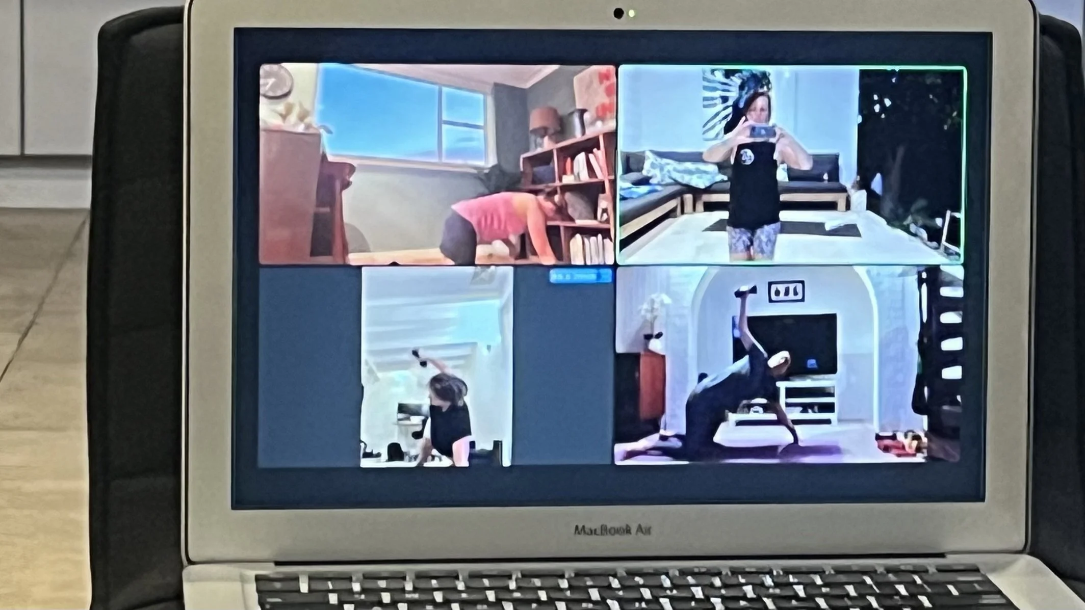 All you need is to be able to log into Zoom, have a small amount of space available to move and some light weights or improvise with household items.
